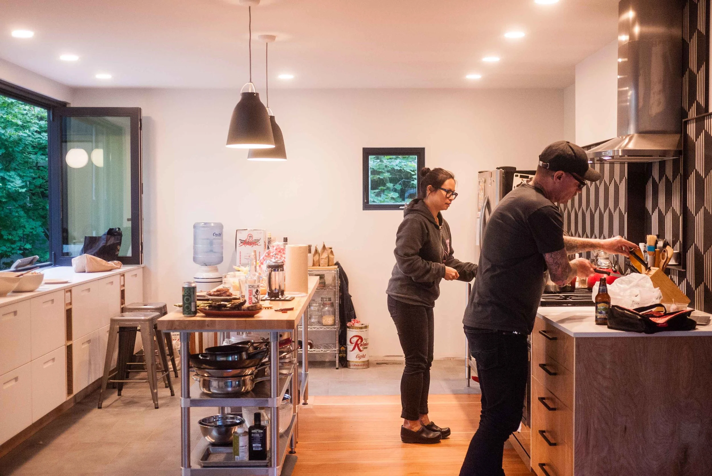 Our clients came to us with a goal: to make their craftsman house last another 100 years. To achieve this goal we would need to make the house work for their lifestyle. They love to cook and entertain, but their existing house, with its cramped kitchen, limited space to congregate and lack of connection to the yard, made it hard to do so. They are also avid bicyclists, but did not have a convenient place to store their bikes. An open, airy addition on the back of the house allows our clients to entertain and enjoy their daily lives, while a bike entry, ramp and parking and maintenance zone elevate their bike commuting lifestyle. Years later, they returned to us with a second phase project: a new entry and updated windows and siding on the original craftsman house, as well as a a bathroom renovation/addition, bedroom renovation and a sauna.